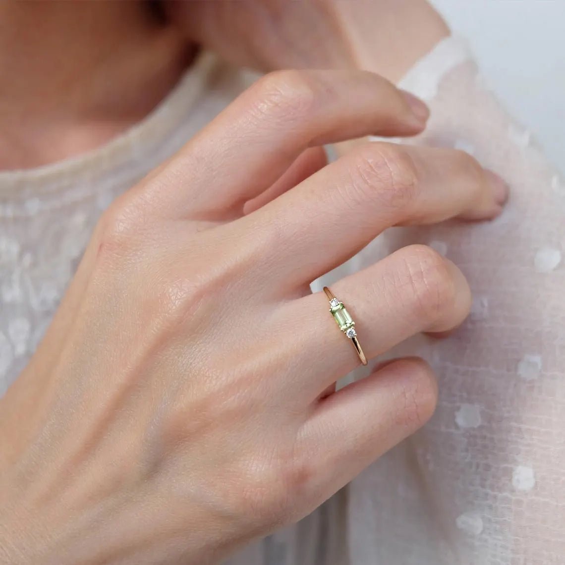 The Peridot Diamond Ring Lucian is a radiant and sophisticated creation that beautifully combines the fresh, vibrant green of peridot with the sparkling brilliance of diamonds. The peridot, with its lively lime-green hue, is said to symbolize renewal, positive energy, and abundance, bringing a sense of vitality and joy to those who wear it. Its bright color captures the essence of nature’s rebirth, making it a perfect gemstone for those seeking harmony and growth. Paired with the peridot are shimmering diamonds, which add a layer of timeless elegance and luxury. Known for their exceptional clarity and dazzling sparkle, diamonds enhance the peridot's vibrant green tones, creating a harmonious contrast that captures both attention and admiration.